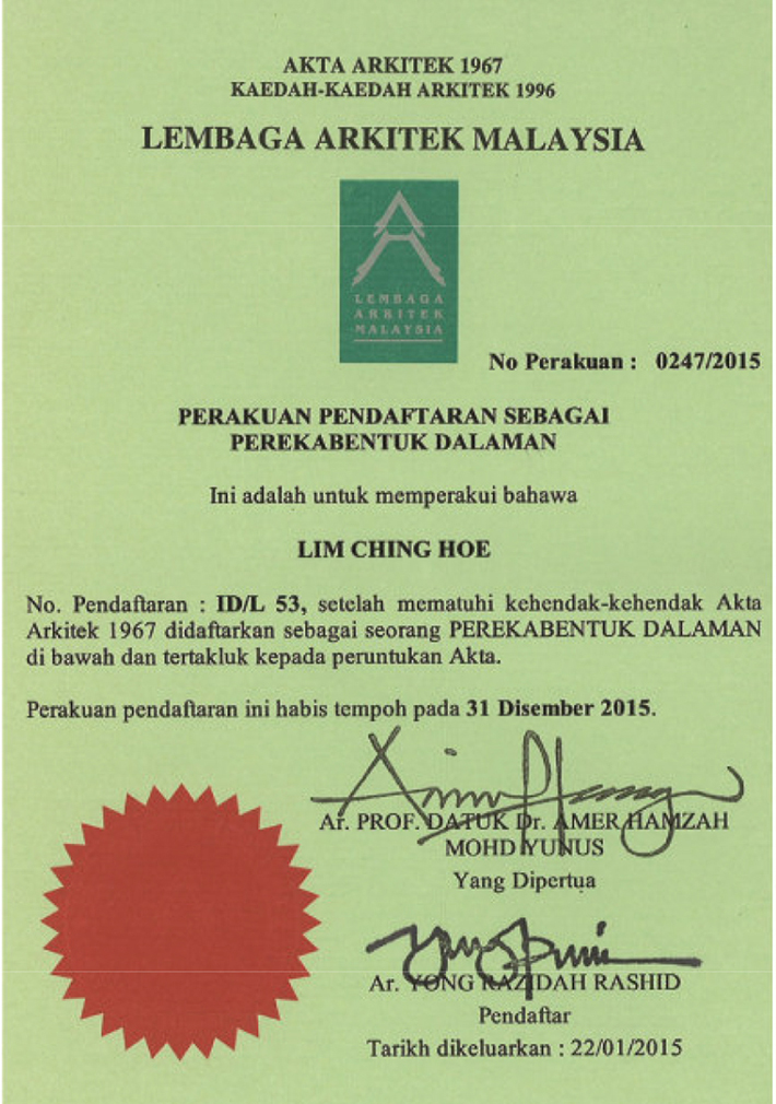 Kim, project designer, holds a Bachelor Degree of Science in Housing, Building and Planning, University Science Malaysia, Penang (Major in Architecture).