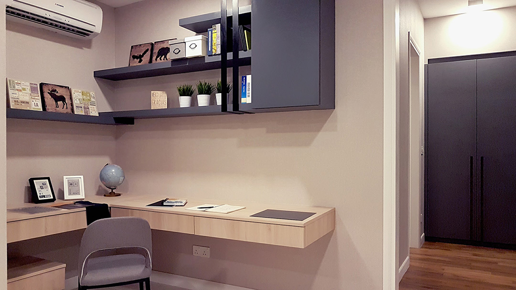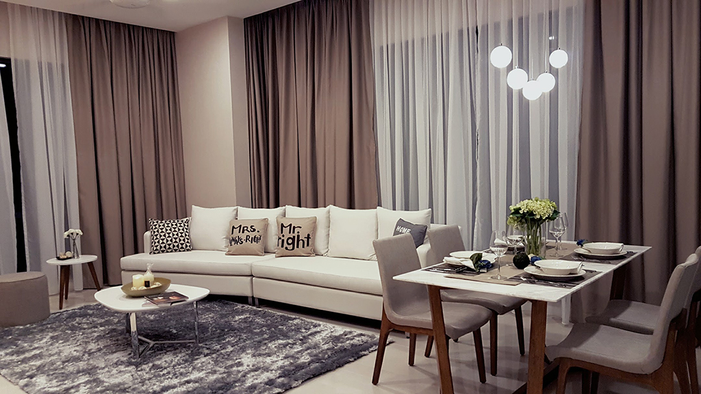 Type-C is a 2-room condominium in 1159 square feet. Modern contemporary is the concept for type-C show unit which located in the city center. Open floor plan for living, dining, kitchen & study area make the unit look spacious. Wall between dining and kitchen is replacing by kitchen peninsular.